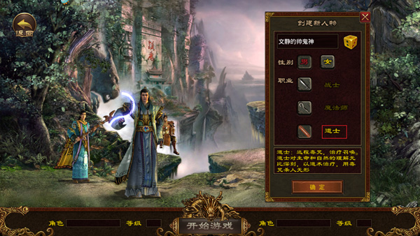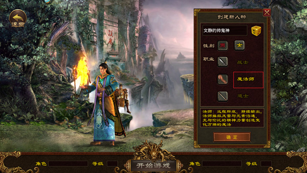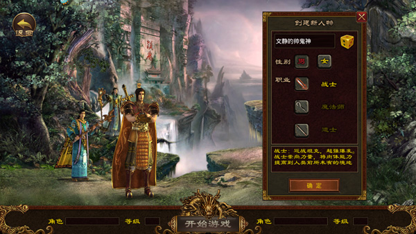 1、进入角色界面系统会推荐6为角色以及三位职业(战士,魔法师,道士)