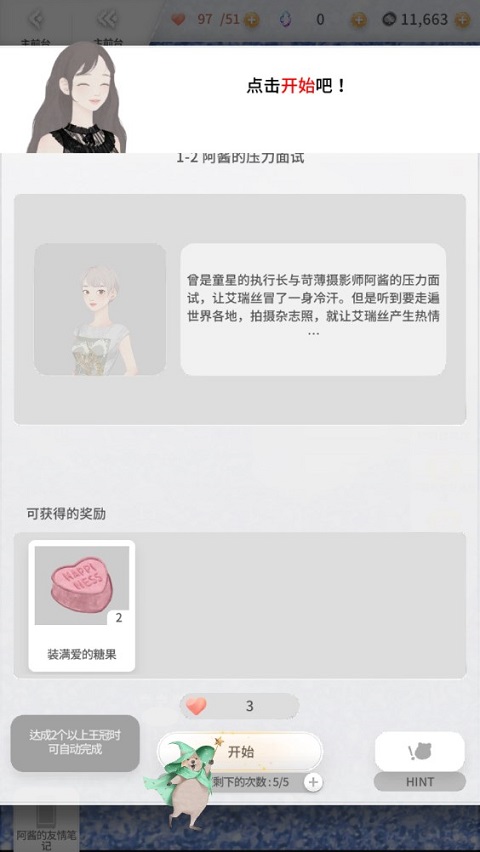 5、游戏以剧情来划分章节关卡,每一关都设置了独特的挑战任务。只需点击“开始”,你便能在沉浸式体验剧情的过程中,尽情感受换装带来的独特魅力!