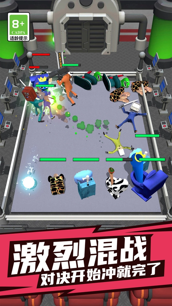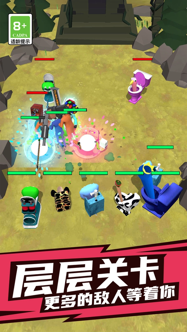 1.搞怪合成系统:通过拖动相同角色即可完成合体,解锁更高级的马桶人形态,搭配独特外观与强化属性,战力逐步暴涨。