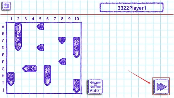 3、然后就进入到了一号玩家的布阵阶段,这里的话,点击Auto按钮可以一键随机布阵,布阵完成后点击右下角的【下一步】图标。
