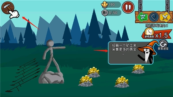1矿工:点击采矿图标,当接近金矿时开始工作。当背包里的黄金装满后,指引矿工回到雕像后面卸载黄金。