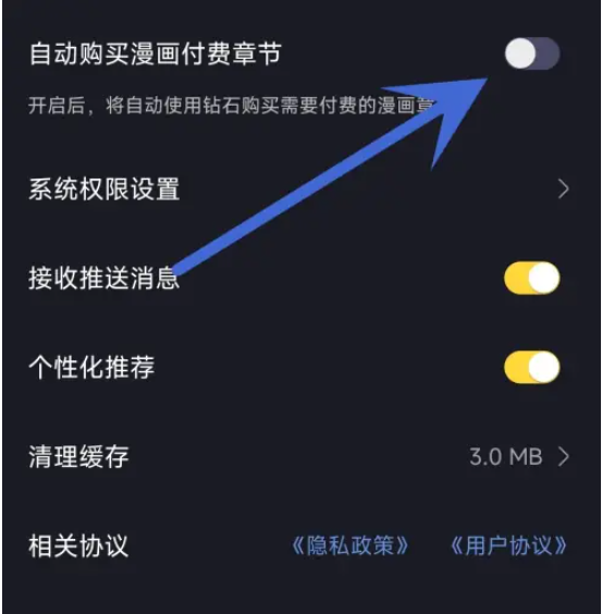 4、最后点击开启自动购买漫画付费章节后的开关