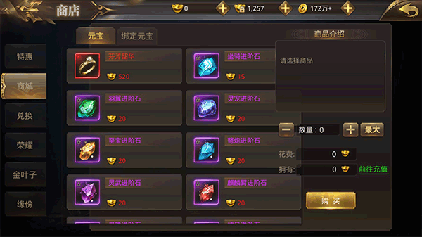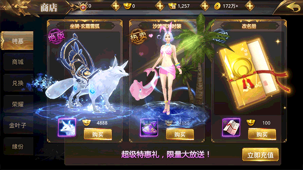 这两者和传统商城有些相似,购物都得用充值获得的元宝,说白了就是得花钱氪金。特惠板块通常会有坐骑、时装这类挺不错的道具,买不买就全看个人喜好啦,说实话也就是外观好看罢了。商城里还能用绑定元宝消费,但大多是进阶道具等所需的材料,价格高得离谱,一般人不太买得起,因此不建议经济实力不足的人购买。