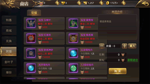 荣耀商店需要参加武道会,可以兑换各种仙宝。