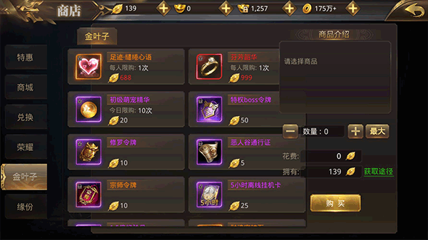 这就是个很神奇的特殊商店了,其主要兑换币金叶子只能通过完成日常获得,产出非常有限,因此如何花费就比较讲究了。推荐兑换恶人谷通行证和挂机卡,这两个都是便宜高收益的东西。另外洗髓丹也可以在这里换到,如果需要重置人物属性潜能的话不妨换一个玩玩