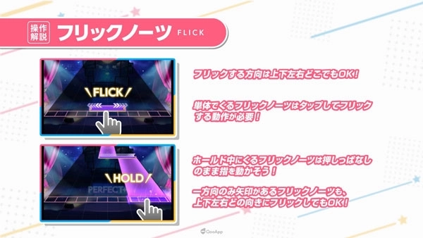 关于滑动方向的紫色FLICK音符,除极少数情况下有指定方向,基本上所有FLICK音符可以往任意方向滑动。 而长按的青白色「HOLD」音符,即使最一开始 MISS,只要途中有按到最后也没有问题,更可更换按住的手指。