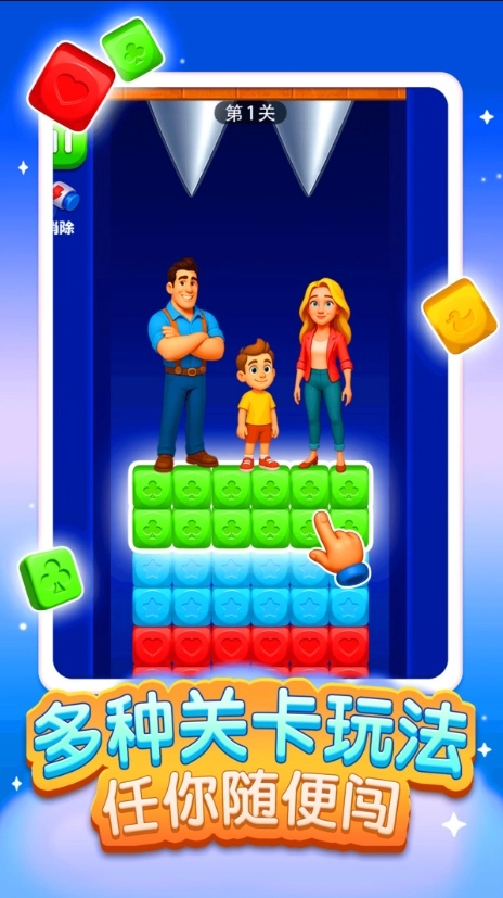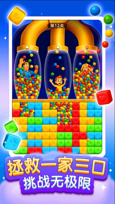 《拯救一家三口》是一款结合了经典消消乐玩法与紧张密室逃脱元素的休闲益智游戏。玩家需要通过消除关卡中的方块来开辟逃生路线、移除致命障碍或激活重要机关,最终目标是将被困在充满危险的密室中的爸爸、妈妈和孩子安全解救出来。在游戏中,巨大的滚动球体、下降的锋利锯齿等动态威胁不断逼近,考验着玩家的消除策略和时机把握能力。不同于传统的以追求高分为目的的消消乐游戏,这款游戏的核心在于利用消除作为解谜手段,帮助一家三口找到生路,为玩家带来独特的智力挑战体验。