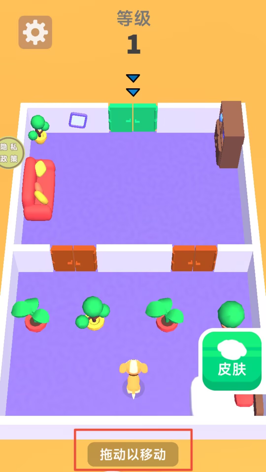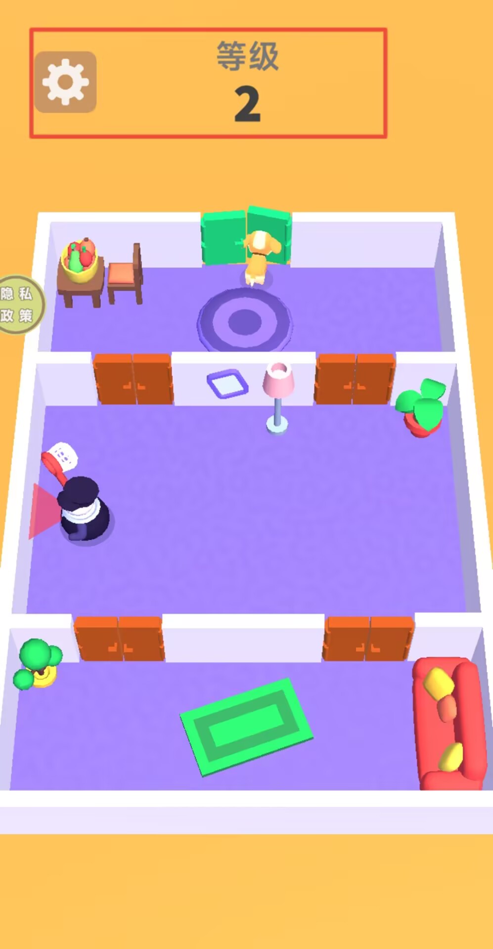 2、界面顶部显示当前关卡难度及设置选项,操控狗狗移动时需保持隐蔽,避免进入敌人视野范围导致失败。