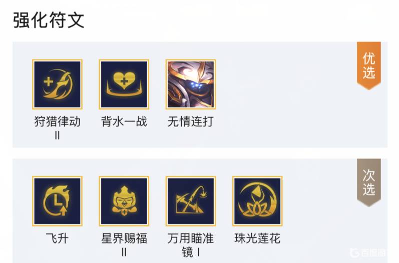 2.强化符文选择:优选狩猎律动2,背水一战,无情连打;次选飞升,星界赐福2,万用瞄准镜,珠光莲花。