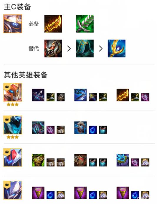 3. 装备推荐:主C的武器,羊刀与饮血剑必不可少,第三件装备优先选择泰坦,要是没有泰坦,水银或者大天使也都行;瑟庄妮配备鬼书和圣盾使的誓约;蕾欧娜装备狂徒、反甲以及离子火花;瑟提则搭配三圣杯。