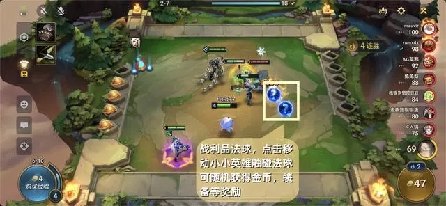3、玩家能控制的在战场上可随意移动的叫小小英雄,用来选秀抢装备抢人,和拿战利品法球。战斗开始后,场上的英雄自动战斗,无法控制。