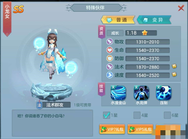给大家讲讲小龙女,这是个首充礼包,性价比超高,仅需6元。重点是,还会送你5元代金券,算下来实际上你只花1元就行。小龙女实力相当强劲,技能属于群攻类型,其中一个技能能随机攻击3个目标,另一个压制技能,对处于眩晕状态的角色,能额外造成4.5的伤害。因此,小龙女堪称所有玩家前期必不可少的角色!