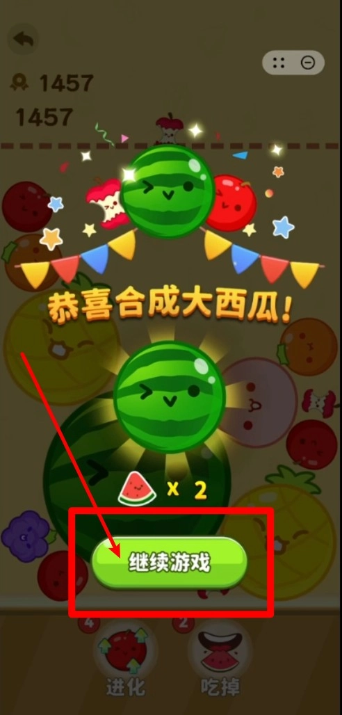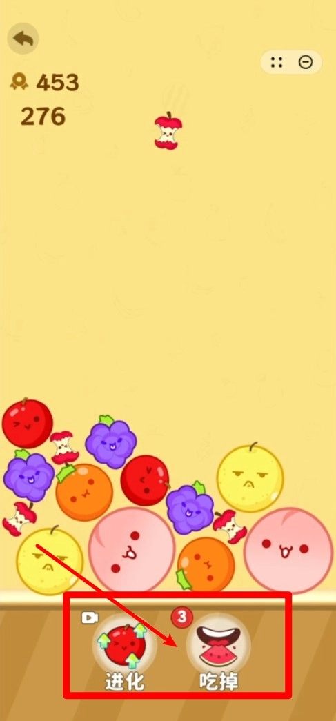 2. 功能快捷按钮:在画面下方设有“进化”与“吃掉”这两个道具按钮,点击它们能够快速处理果实堆叠的情况,实现轻松清场,进而提升合成效率。