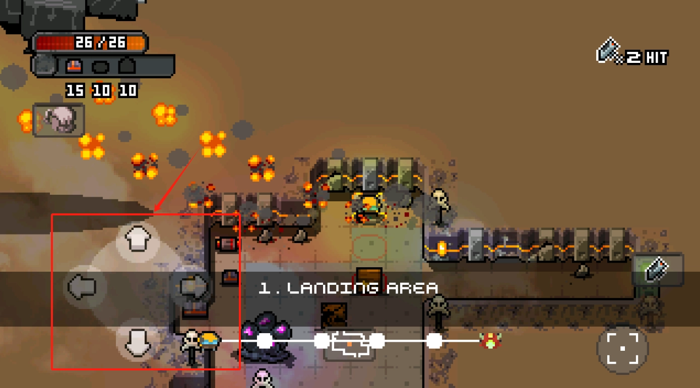 3、通过下方的方向键来操控角色移动,要留意左上角显示的血量与资源情况。右侧的武器可用于攻击敌人,所处场景为登陆区。