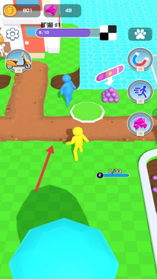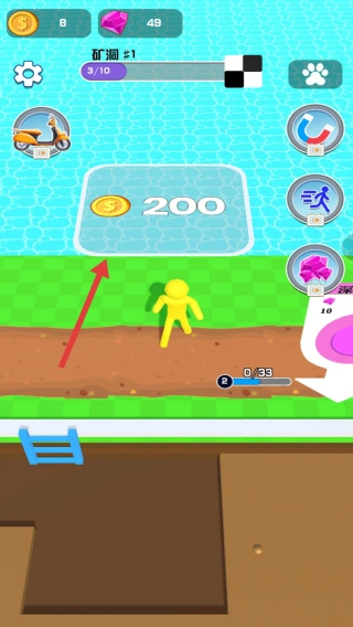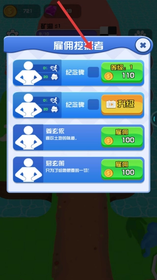 1、玩法机制为操控黄色小人,于矿区进行挖掘并收集金币。可通过雇佣诸如纪念碑、春艺依等挖掘者,对矿工加以升级,以此提升挖掘效率,推动矿洞进度(从8/10推进至3/10 )。