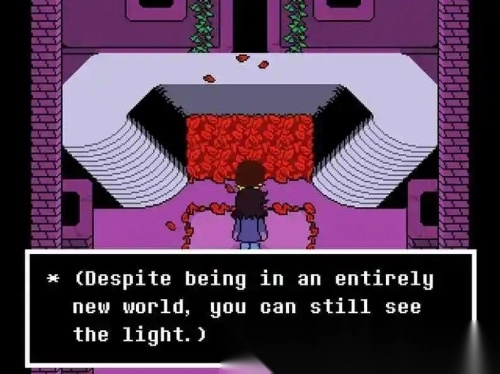 从跌落的地方向右侧的门走去,进去后你会遇到一朵花,他名叫花儿。他知道你刚来到地下世界时会感到困惑,因此他打算向你介绍这里人们的生活,并解释心形的作用。