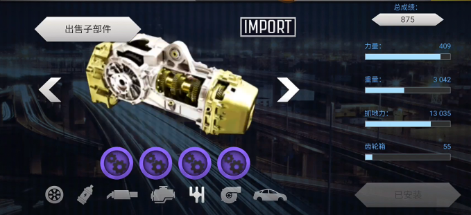 1、当您进入游戏后,点击“升级”按钮,就能查看赛车的各个部件以及其性能表现,您可依据自身需求来对赛车进行升级。