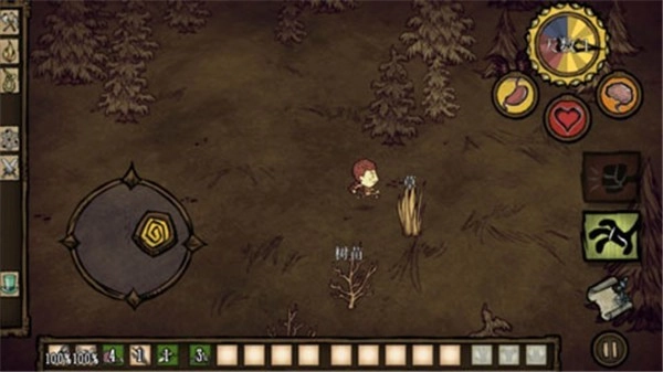 6、游戏正式开启,屏幕左边用于控制角色方向,右边则是负责收集相关操作。玩家得收集所有可利用的资源,以此来躲避饥荒。