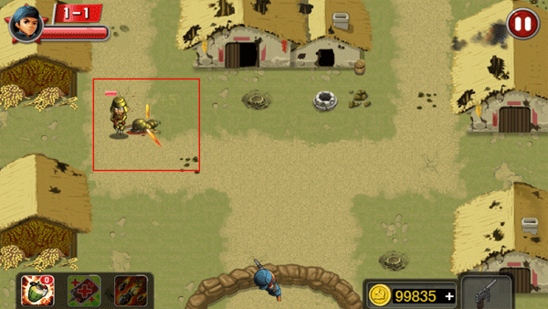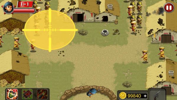 按照鬼子所在方向长按屏幕,便会触发连续的子弹攻击,右侧的枪图标可用于切换武器。