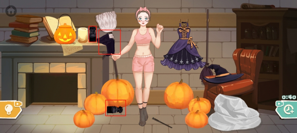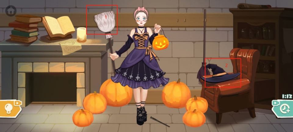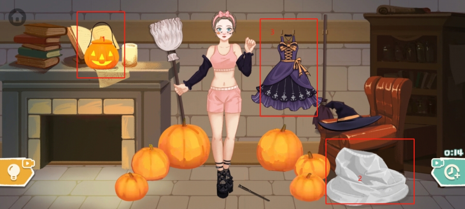 9、接着,将扫帚放置在小姐姐的右手处,再用小刀把周边的南瓜雕刻成南瓜灯,如此便能成功通关。