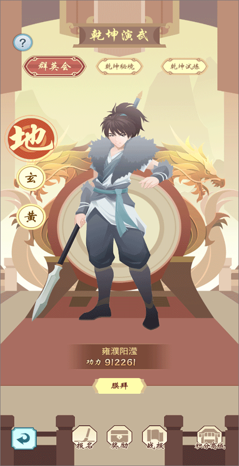 每星期进行两场,玩家报名参加对应等级比试。每个段位排名第一的玩家将会展示在所有玩家的天地玄黄页面,这是一个很好的展示自己实力的地方。