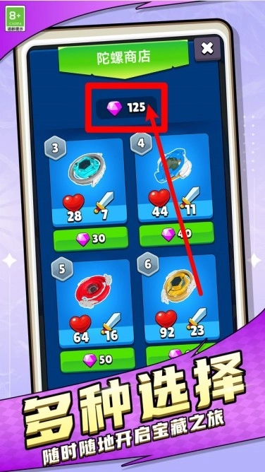 1.使用钻石兑换:通过收集紫色钻石可在陀螺商店中解锁各种等级的陀螺,每种陀螺拥有不同的攻击与生命属性。