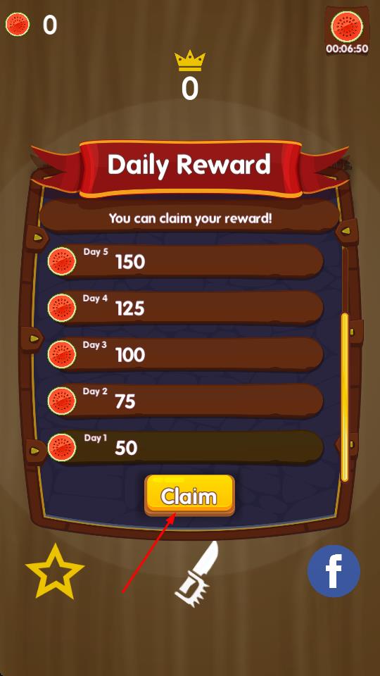 1、当界面显示DailyReward时,点击Claim按钮即可领取相应天数的西瓜奖励,累积资源以助力后续挑战,并开启每日福利的获取流程。