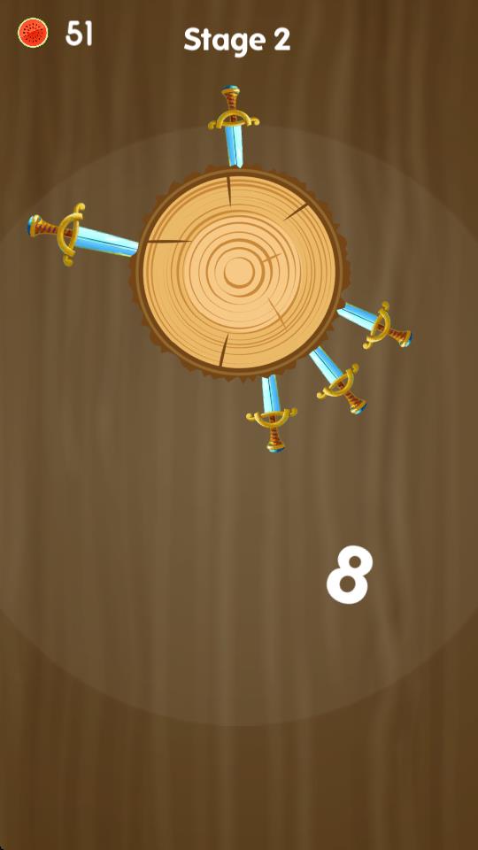 2、进入Stage关卡后,先观察木桩上已有的飞刀分布,找准时机点击屏幕投掷飞刀,注意要避免碰撞,成功将飞刀插入木桩以继续推进关卡。