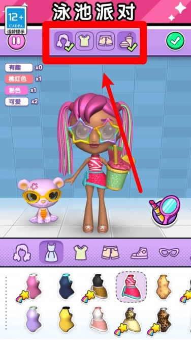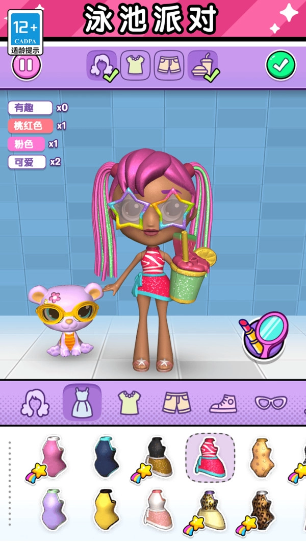 2. 在泳池派对模式里,玩家能够自主挑选发型、上衣、短裤以及饮品道具,从而搭配出既清爽又时尚的夏日风格。