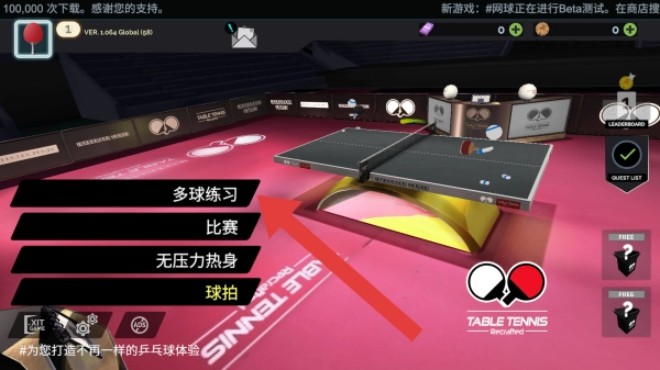1. 展示的是模式选择页面,包含多球练习、比赛、无压力热身、球拍等选项,建议先选择多球练习来展开练习,这是着重突出乒乓球体验的玩法。
