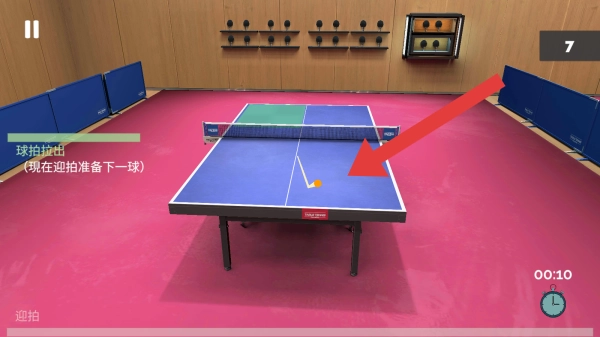 2、画面中呈现出乒乓球桌以及正在进行的球局,界面上出现了球拍,并有迎拍准备下一球等操作提示,该内容旨在模拟乒乓球运动,着重于操作体验。