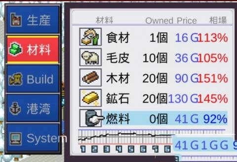 4. 在菜单中,材料界面的显示保持不变。流行度用红色表示下降,蓝色表示上升;中间的数字代表拥有数量,浅蓝色的G数表示价格。如果下方出现“不足”的警告,则意味着你的原材料或货物供应无法满足销售需求,应当增加商品输入或提高原材料生产。此外,Build 表示建造,Save 表示记录,Options 表示设置,Help 表示玩法介绍,八XXXX 表示历史分数,Quit 表示退出游戏。