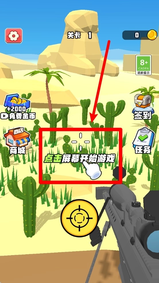 1.进入游戏:点击主界面中央的“点击屏幕开始游戏”按钮,玩家即可进入狙击任务场景,准备开始紧张的射击挑战。