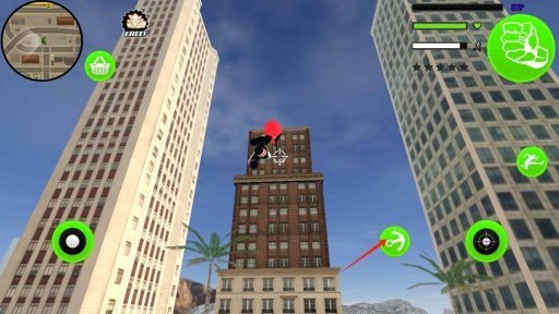 3、点击右侧锚钩按钮,让角色射出绳索,借助绳索在城市建筑间移动,跨越障碍,点击蛛网飞跃。