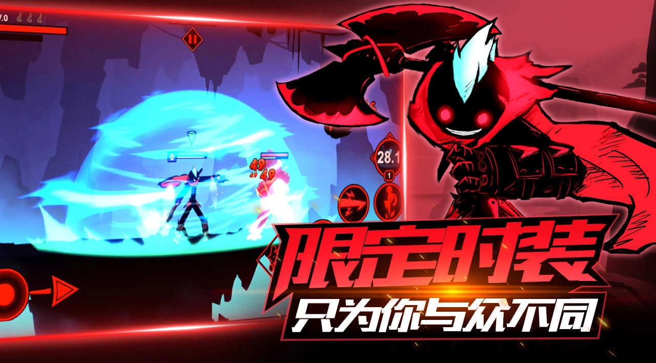 游戏摒弃了传统火柴人模式下的夸张动作设计,采用了更为华丽的特效。值得注意的是,这款游戏从人物到技能,都在很大程度上仿照了当下全球最热门的竞技游戏《英雄联盟》。其QWER按键恰到好处地环绕在普通攻击按键周围,契合了玩家对这类格斗游戏的操作习惯。虽说它是仿照之作,但游戏的连招表现尚可,毕竟作为一款快节奏游戏,技能冷却时间(CD)不能过长。