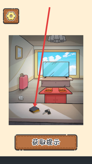 2、点击进入室内场景后,留意粉色行李箱、桌上救生衣,电视和窗户,需仔细查看并尝试互动以获取有效信息。