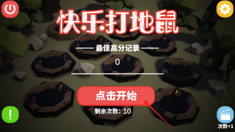 1、点击点击开始按钮,启动快乐打地鼠游戏,界面显示剩余次数为10,玩家需在后续环节,通过操作击打地鼠,积累分数,借助按钮触发游戏进程,开启打地鼠挑战。