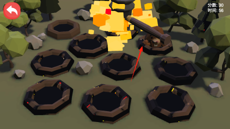 2、地鼠会随机从洞穴中冒出,玩家需快速点击冒出地鼠的洞穴,用锤子击打地鼠,每次成功击打可获得分数,地鼠出现位置不固定,考验玩家反应速度,持续获取分数,推进游戏。