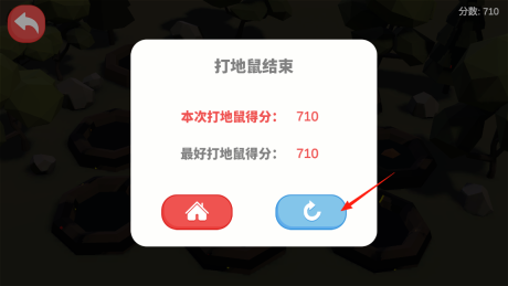 3、在结算界面中,会显示本次游戏的得分和历史最高得分。如果你想再次挑战,可以点击蓝色的“重新开始”按钮,这样就能再次进入游戏,继续击打地鼠,并尝试刷新你的分数记录。如果想回到游戏主界面,点击红色的“主页”按钮即可。