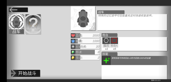 载具战车/坦克/飞机/a1/飞碟/虫王/猎手有几种,以我个人的经验和喜好,新玩家入门是推荐a1或者战车。为啥呢,先说战车,身板还不错,格子也多,有一个通用中后期可以装飞机或者护盾或者维修站,前期装治疗僚机也能帮新手回回血,其次是技能,300能量换个巨额回血,对新手真的很友好,但是缺点就在于这载具攻击是定向和不太高的初始速度,需要手动瞄准,这也是一开始萌新最头疼的事情了,但是这个缺陷后期是可以弥补的,lv4激光在提供超高伤害的同时是自动锁定敌人的,所以问题也都不大。