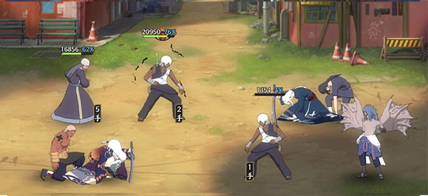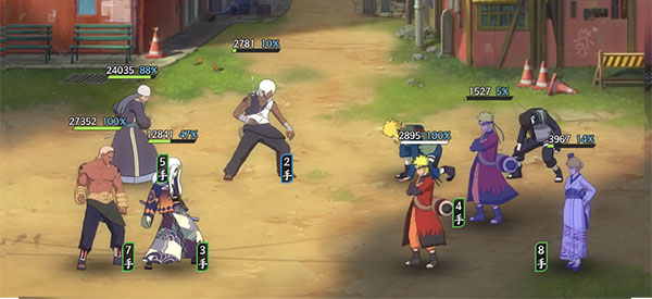 第一回合,三船奥义敌方大蛇丸【青年】,遭到波风水门【青年】的打断。之后双方各自普攻,从图中可以看出,虽然我方佐助【须佐能乎】血量很低,但敌方的波风水门【青年】在我方忍者的多次普攻以及追打后战败,所以我方可以在第二回合实现四打三。