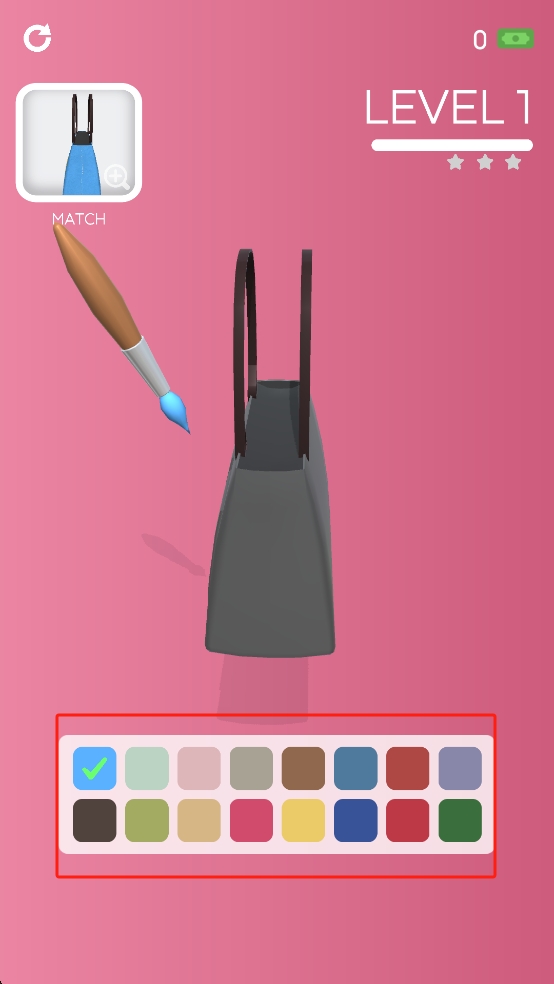 1、依据左上角的预览图,我们选用调色板左侧标有对勾的蓝色颜料,使用画笔工具为灰色包包上色,从而开始定制过程。