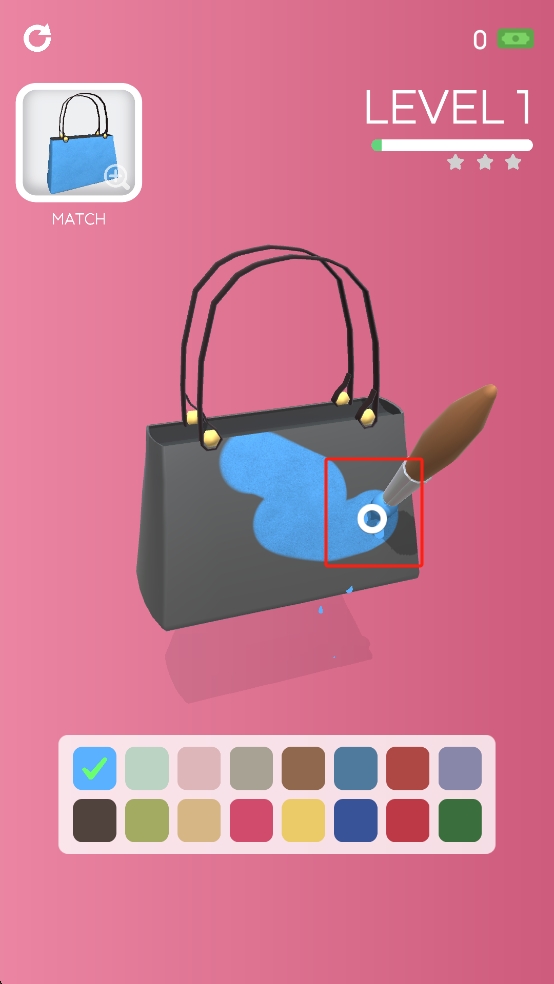 2、用画笔持续涂抹红框区域,将蓝色颜料均匀覆盖包包表面,参照左上角模板,逐步填充至完整色彩,完成染色。