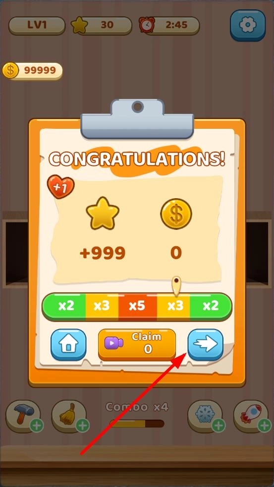 3、摆放好货物后,如果满足关卡的要求就能通关,此时界面上会出现恭喜的信息。点击“Claim”右边的箭头按钮,就可以进入下一关并领取奖励。