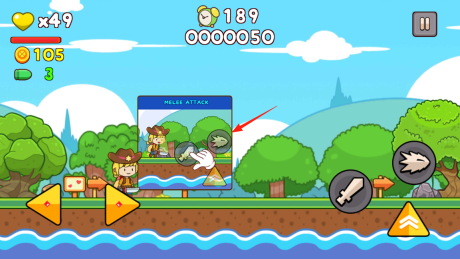 2、游戏中触发近战攻击教学,按照指引,点击近战按钮,使角色发动近身攻击,攻击敌人可获取金币,提升战斗能力,借助近战操作,开启战斗流程,体验战斗乐趣。
