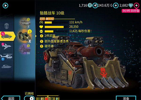 Top1骷髅战车:它是之前活动的奖品,也是目前游戏中威力最为强大的载具。其主炮具备瞬间摧毁任何载具的能力,副炮则兼具对空和对地攻击的功能。此外,骷髅战车还拥有碾压技能,能够轻松压扁其他载具。然而,它存在一个显著的缺点,那就是速度极为迟缓,无法快速行驶。