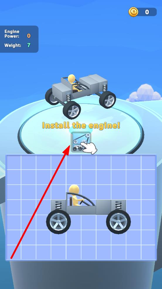 1进入造车界面,根据提示“安装发动机!”,将发动机部件拖放到汽车的相应位置以完成组装。完成基础造车后,即可开始赛道挑战。