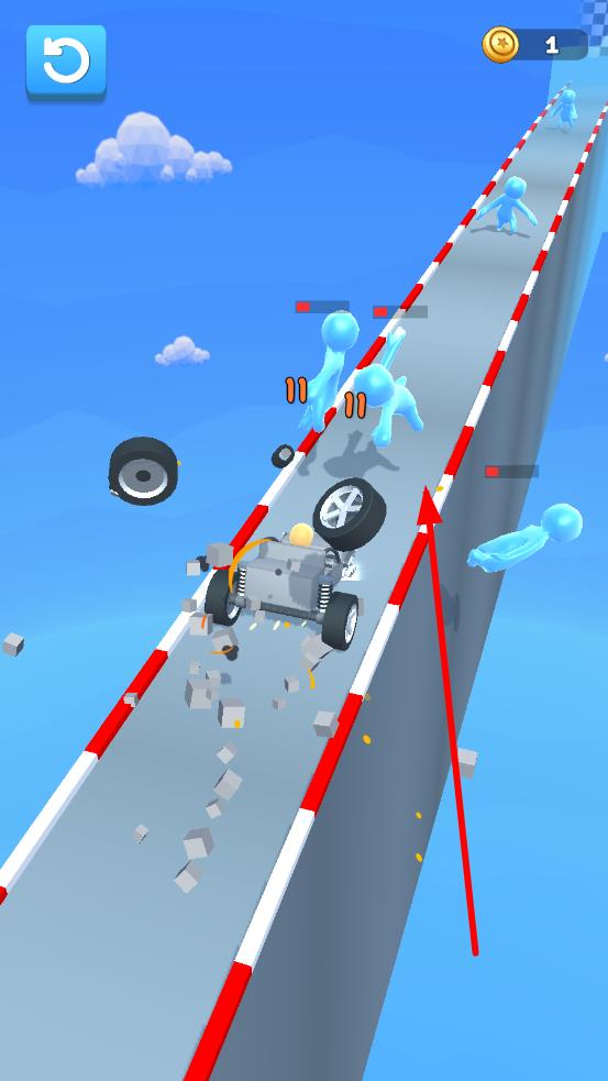 2、在赛道上,控制汽车左右移动和跳跃,避开蓝色敌人和掉落的轮胎等障碍物,保持车辆完好无损,并冲向终点。