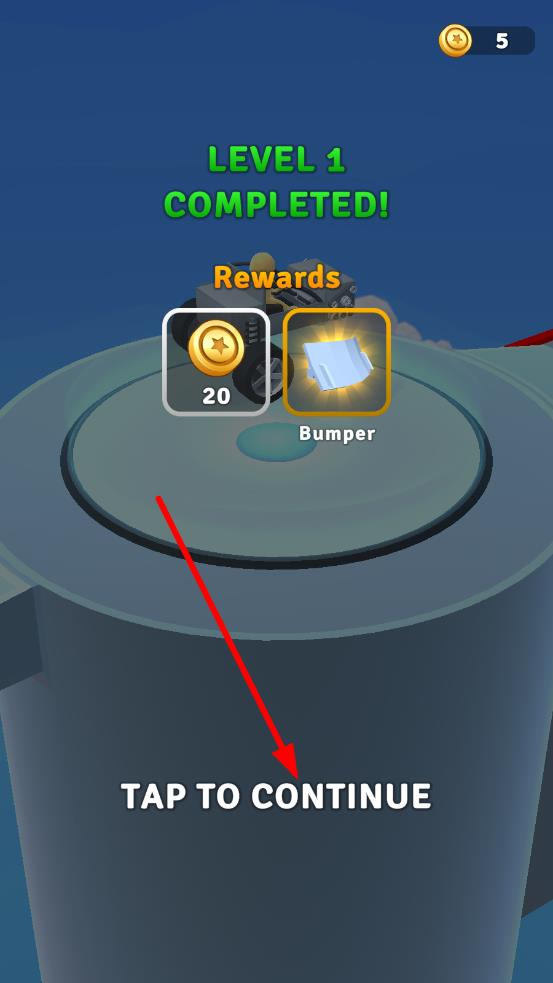 3、通关后,屏幕上会显示“LEVEL 1 COMPLETED!”,点击“TAP TO CONTINUE”,可以获得金币、Bumper等奖励,用来升级车辆部件。
