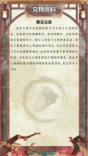 《翠玉白菜》顾名思义是一件由翠玉琢碾而成艺术品。在游戏中得之,除了可以为展馆带来人气和收入外,更重要是可以让博物馆添加上【豆绿】色彩。